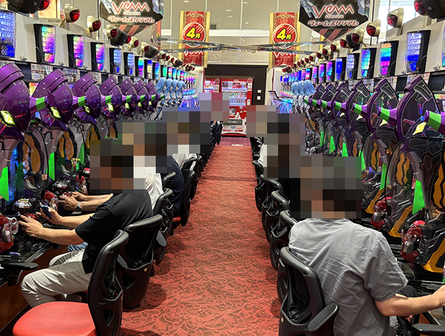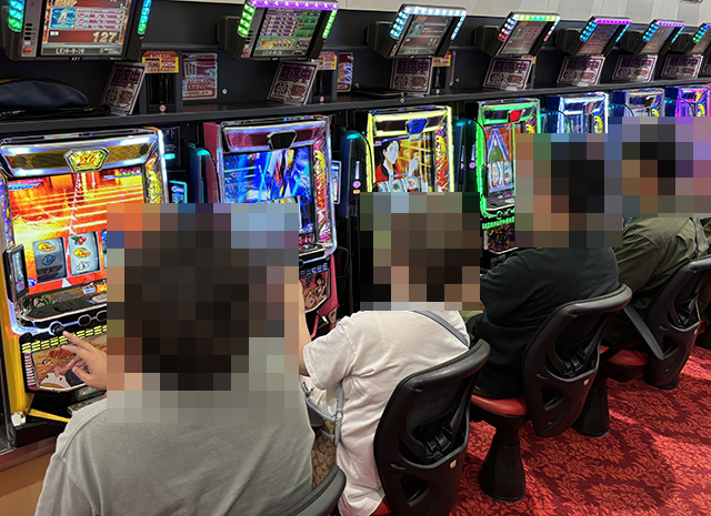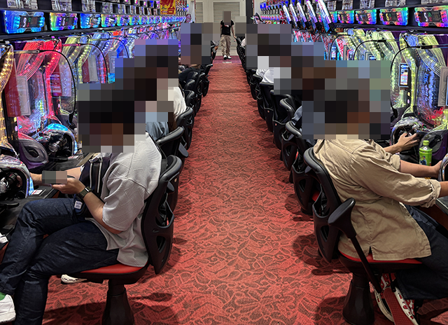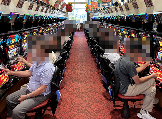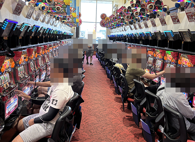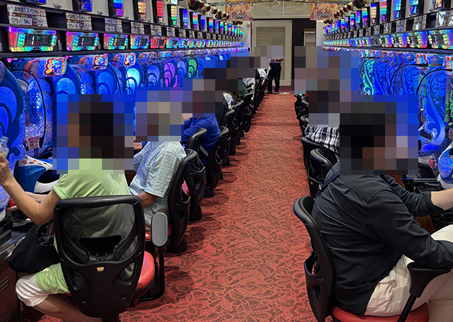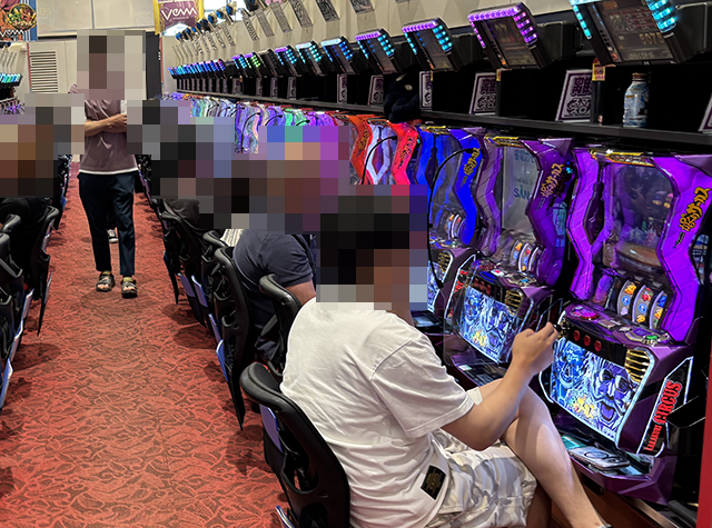 7月27日の店内は、パチンコもパチスロも多くのプレイヤーでにぎわっていた。