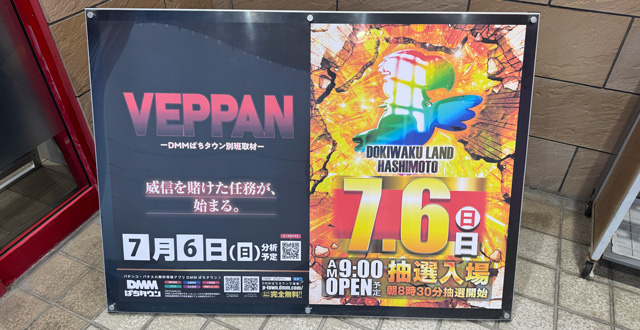 DMMぱちタウン取材班〝別班〟が威信を賭けて執り行う「VEPPAN」が、7月6日に「ドキわくランド橋本店」にて実施された。取材当日は朝イチから86人のファンたちが集まり開店時から大盛況! 取材時も多くのファンたちで活気に溢れていた。果たしてどれほどの盛り上がりを見せていたのか、ここからはスロット全226台の詳細とともに、当日の店内の盛り上がりをチェックしていこう!