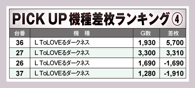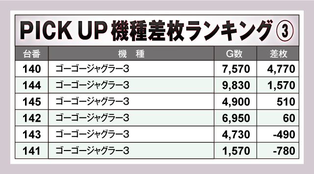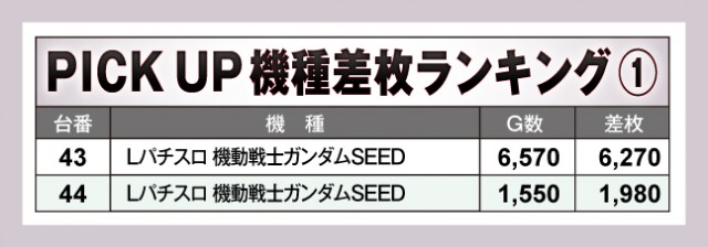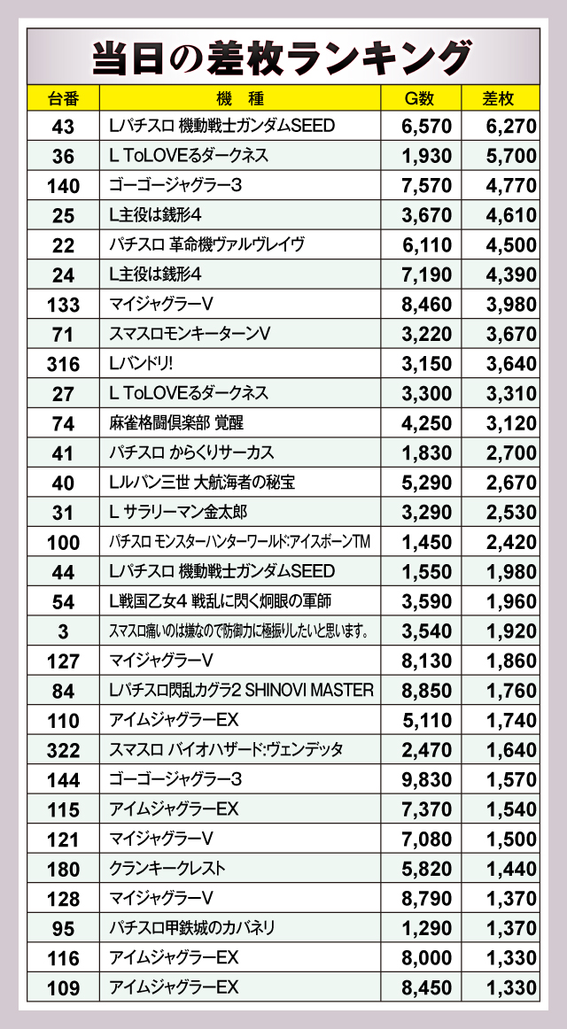 まずは差枚ランキングのチェックから。30台のうち15台が差枚+2,000枚オーバーで、+3,000枚オーバーは11台出現。それらのなかでもっとも優秀だったのは、43番台の「Lパチスロ 機動戦士ガンダムSEED」で、差枚は+6,270枚をマーク! その他ランクイン機種をチェックしてみると、人気スマスロ機種を筆頭に、ジャグラーシリーズも複数台ランクイン。訪れたファンたちが存分に楽しめる環境が整っていたようだ!