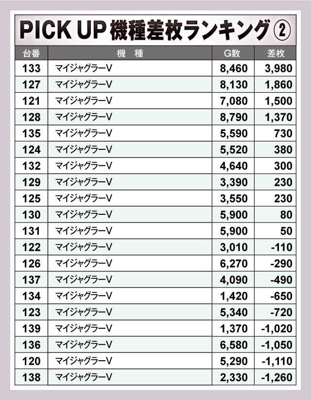 続いては、当日とくに盛り上がっていた4機種を紹介。4機種すべてから良台が出現していたが、とくに「マイジャグラーV」は、ピックアップ20台のうち11台がプラス終了しており、4ケタプラス終了は4台と素晴らしい結果を確認! これらの機種たちの盛り上がりを見れば、当日どれだけ賑わっていたかが分かってもらえたハズだ!