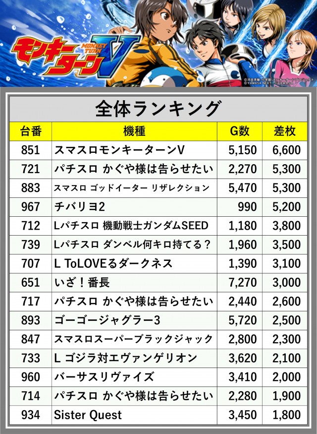 厳選された取材対象機種をはじめ、その他スロット全体から好記録が飛び出した!プレイヤーが楽しんだ1日を下記データにて振り返ってみて欲しい。