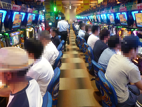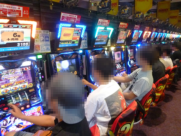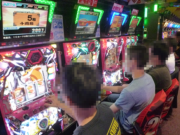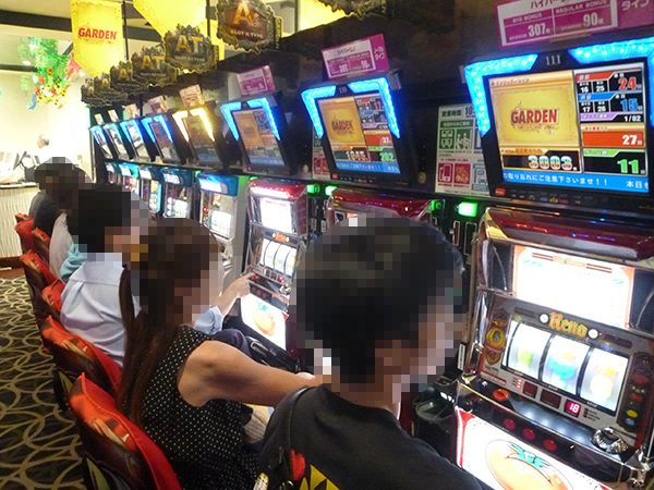 1000円/186枚パチスロも空き台が見当たらないほどの高稼働。プレイヤーたちの笑顔からも心から遊技を楽しめていることがうかがえた。