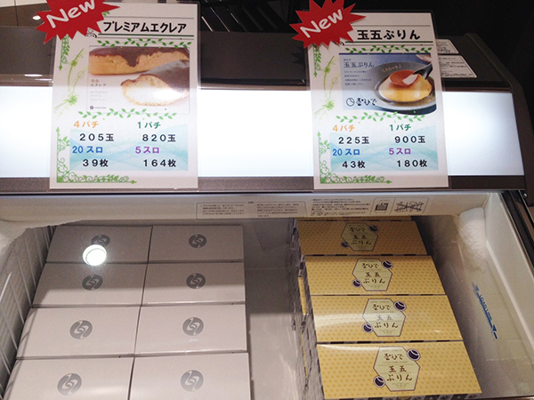 同店の景品コーナーは充実した品揃え。この日は“プレミアムエクレア”や“玉五プリン”などお取り寄せスイーツも用意され、多くのプレイヤーから好評だったようだ。
