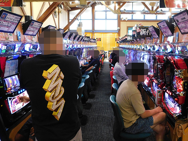 取材時は既に多くのプレイヤーが集結し、パチンコ・パチスロを問わずにぎやかな状況となっていた。