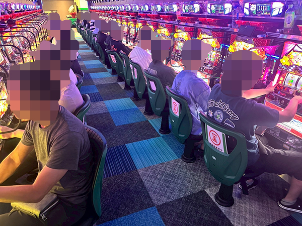 機種構成が魅力的な500円/89枚パチスロを見ると、ほぼ満席となるほどの支持を得ていた。