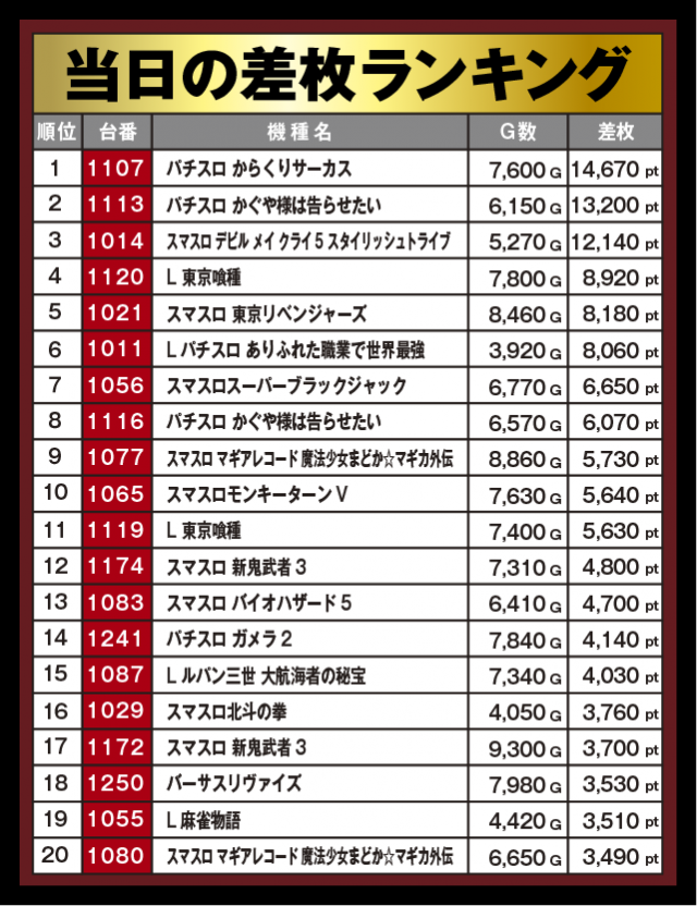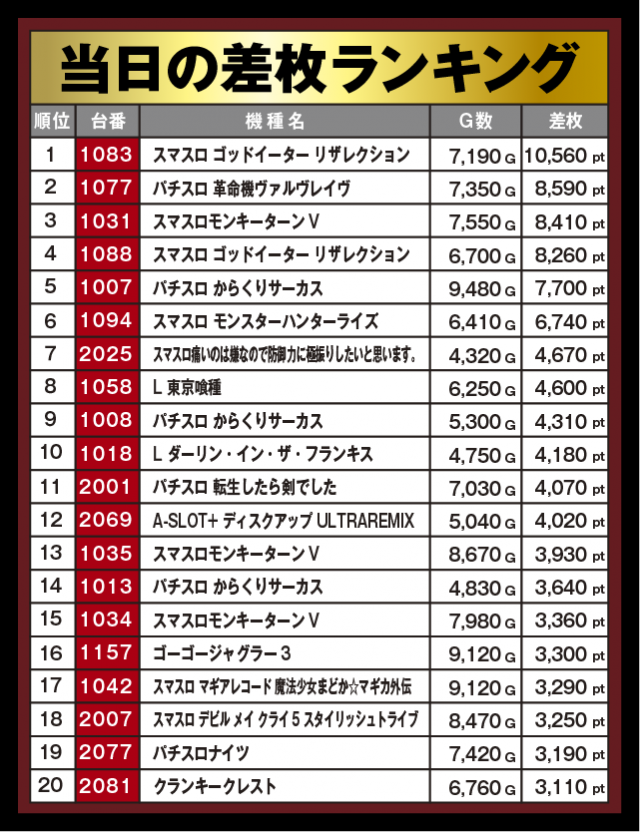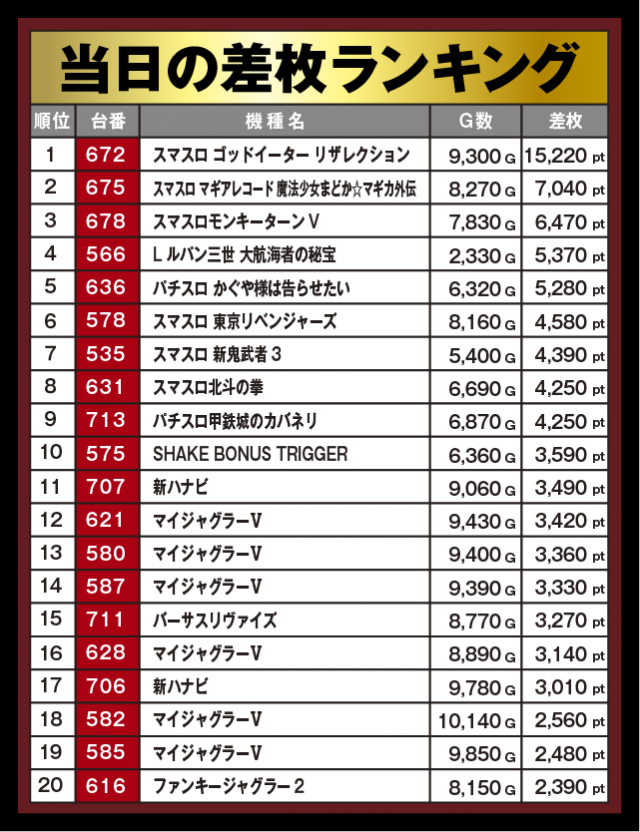 この日のSAPグループはひと味違う。DMMぱちタウンは、東京都内SAPの特別な3日間を一斉取材した。特に華々しい活躍を残した機種たちをピックアップして紹介しよう。まずは「SAP日野」差枚ランキングの発表だ!