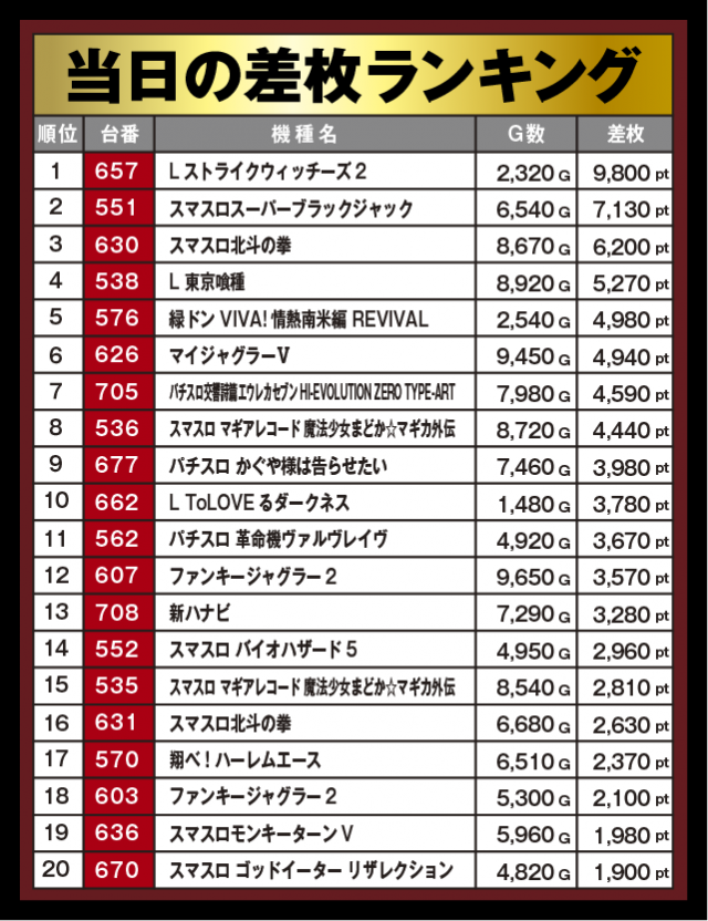 この日のSAPグループはひと味違う。DMMぱちタウンは、「SAP北野」の特別なひとときを一斉取材した。特に華々しい活躍を残した機種たちをピックアップして紹介しよう。まずは差枚ランキングの発表だ!