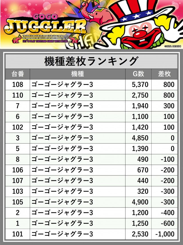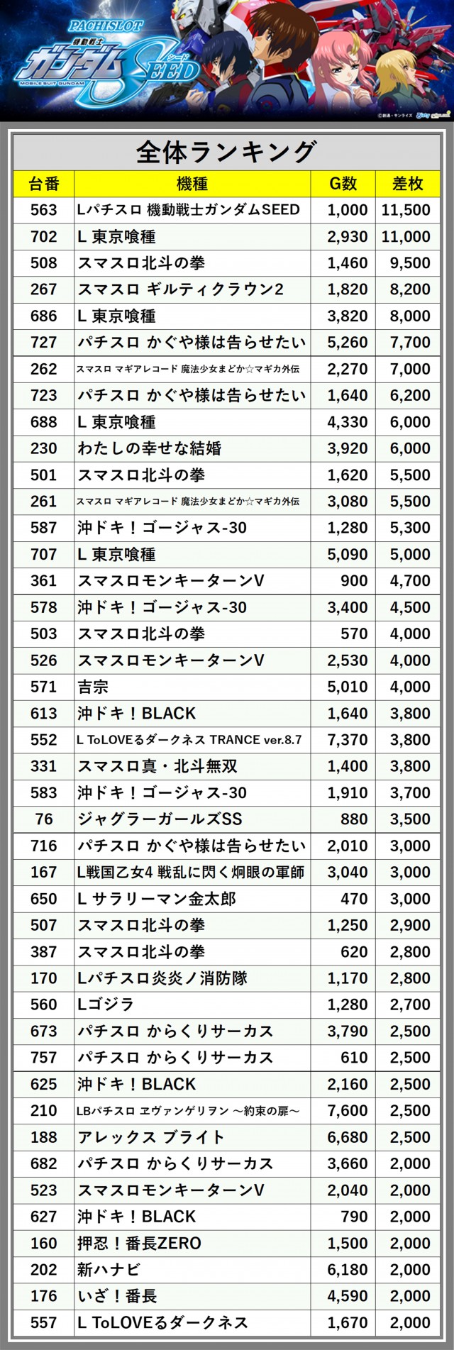 ※差枚数順に掲載しています
