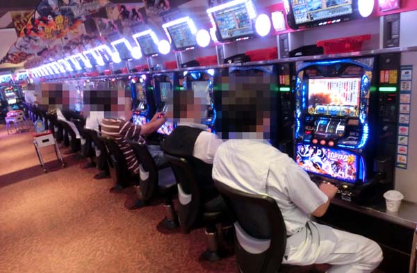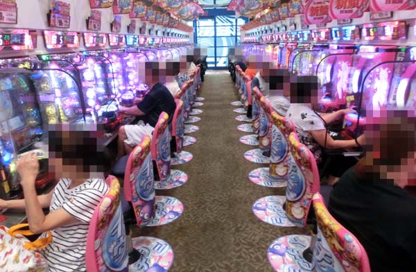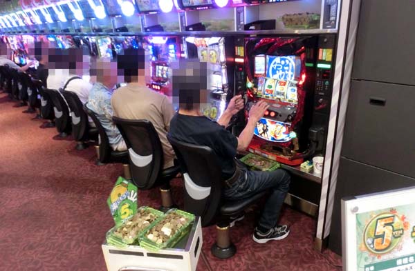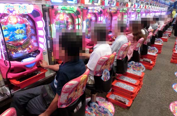 1円パチンコでは海物語シリーズが人気。「イチウミ」と名付けられた海物語シリーズ専用コーナーでは中高年プレイヤーの姿が多く見られ、明るく楽しげな雰囲気となっていた。