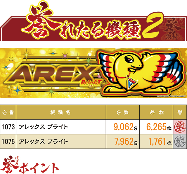 数日前に新台導入されたばかりのAタイプ『アレックス ブライト』が、さっそく大きな爪痕を残してくれた。なんと1073番台が6,000枚オーバー!もう1台の1075番台もちゃっかり誉レコード(=1,000枚以上)に。