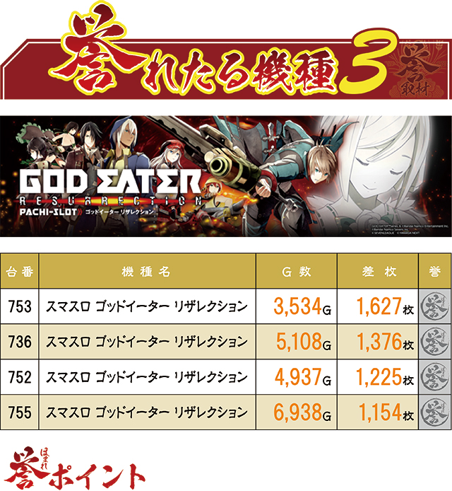 『スマスロ ゴッドイーター リザレクション』は、4台が誉レコードに。残念ながらこの日は青誉マーク(=2,000枚以上)に出会うことは叶わなかった。しかし設置の半数が誉レコードという事実は、控えめに見ても悪くない結果だろう。