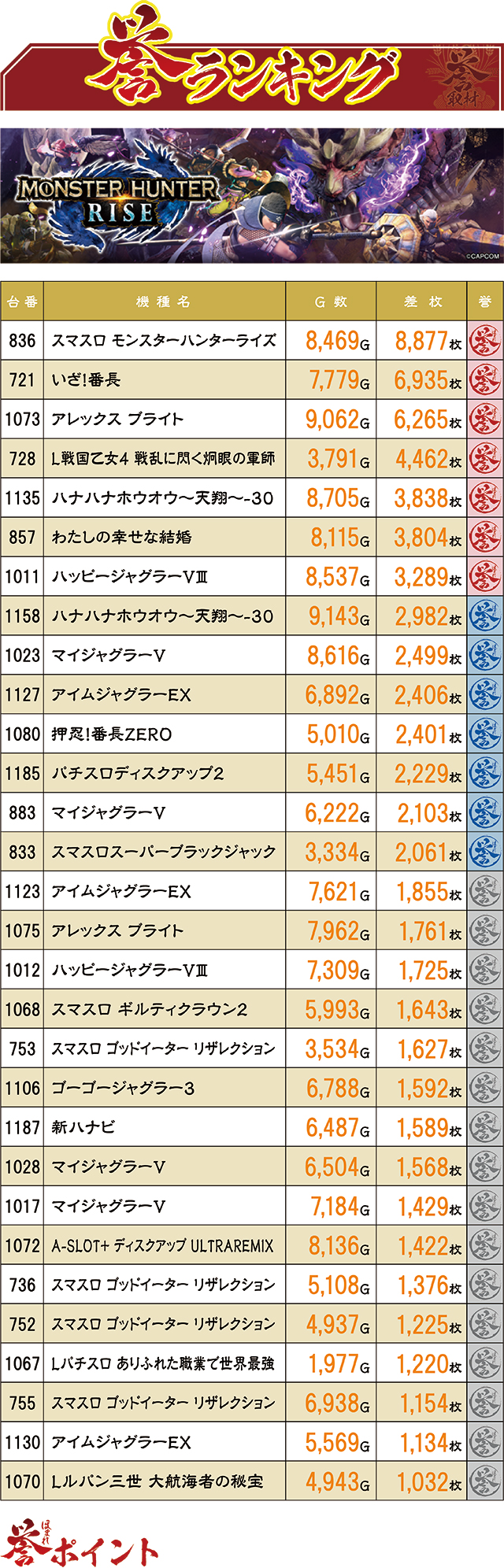 9,000枚に迫る好記録で、この日の首位レコードとなった『スマスロ モンスターハンターライズ』。2位には『いざ!番長』、そして3位には導入ほやほやの新台『アレックス ブライト』がランクインを果たした。新台とはいえ、Aタイプから6,000枚を上回る結果が生まれるとは恐るべし…。