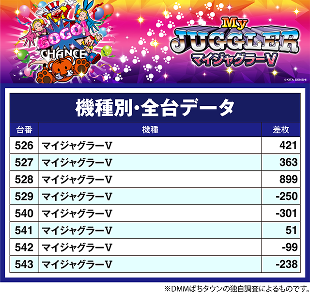 「マイジャグラーⅤ」も半数となる4台が結果を残した。