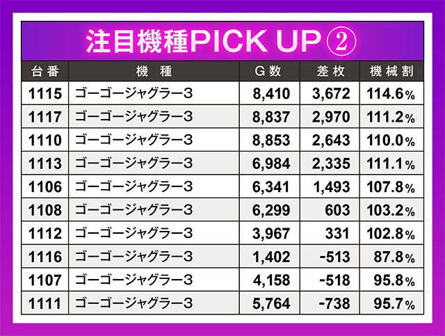 こちらもマイナス台が少なく、プラス台が多数を占めていた『ゴーゴージャグラー3』。マイナスの3台はいずれも総ゲーム数がやや少なく、もっと回されていたらプラスに転じていた可能性が濃厚だ。