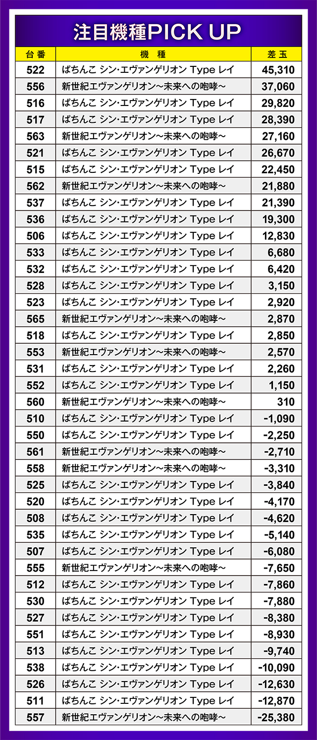 パチンカー&スロッターのテンションが嫌が応にも上昇する7月7日だけに、常連さんのハードルも高かったはず。しかしその期待にしっかり応えてくれた今回。スロでは『北斗』&『ゴージャグ』が強さを見せ、パチでは『エヴァ』シリーズが安定した結果を披露。7月7日に相応しい成績だったと言えよう。