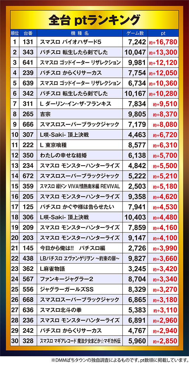 「パチスロ からくりサーカス」の239番台も約+12,000ptを上回るなど、多彩な機種が盛り上がりをみせた。