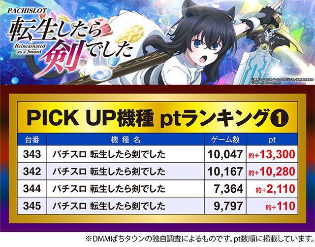最新機種である「パチスロ 転生したら剣でした」の343番台も約+13,000pt以上となった。