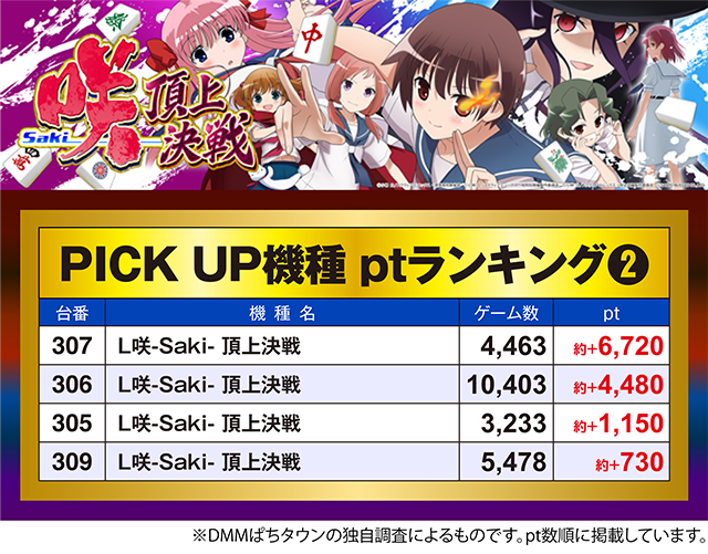 3台が約+1,100ptを超えた「L咲-Saki- 頂上決戦」では、307番台が約+6,700pt以上。