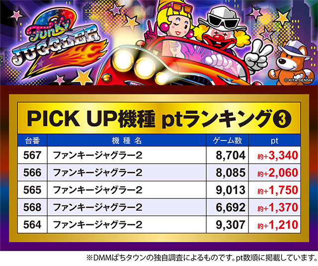 「ファンキージャグラー2」も5台が約+1,200ptを超え、567番台は約+3,340ptを記録した。