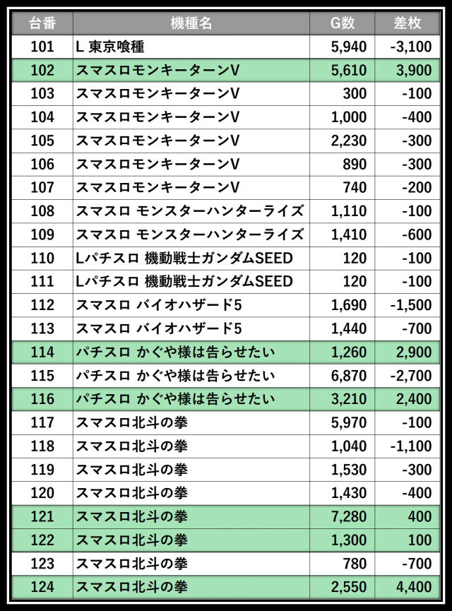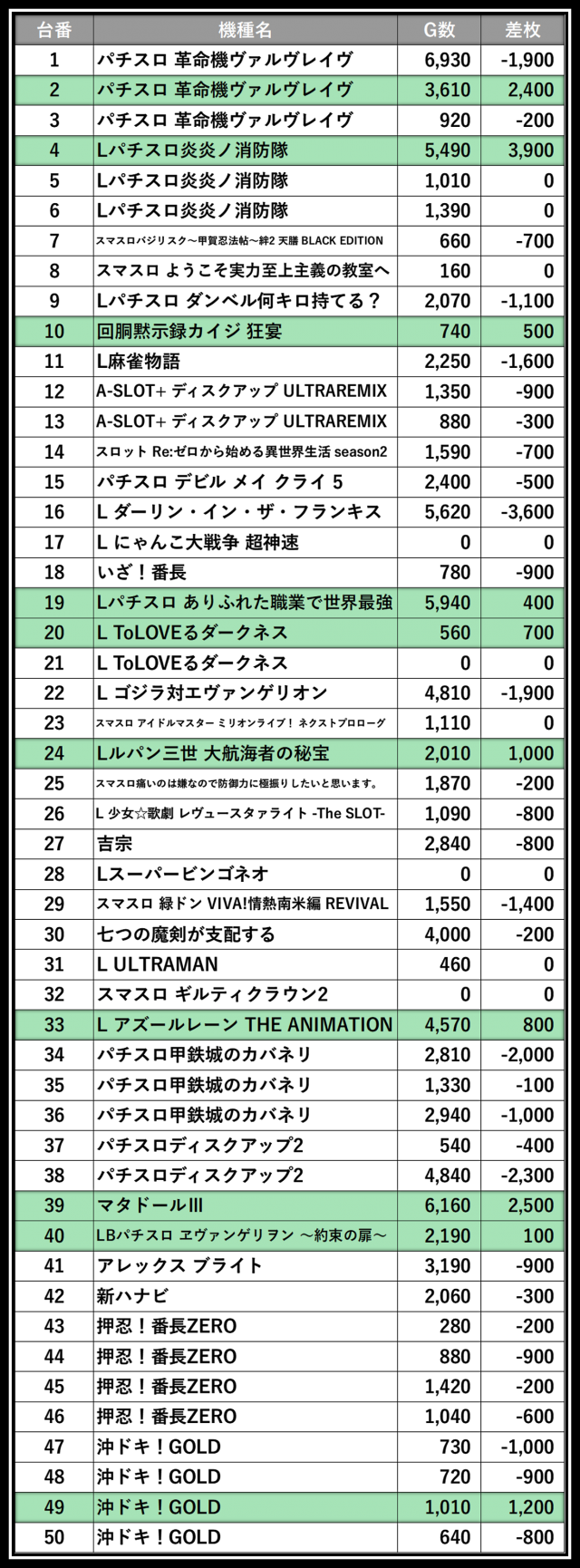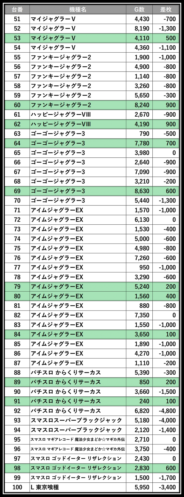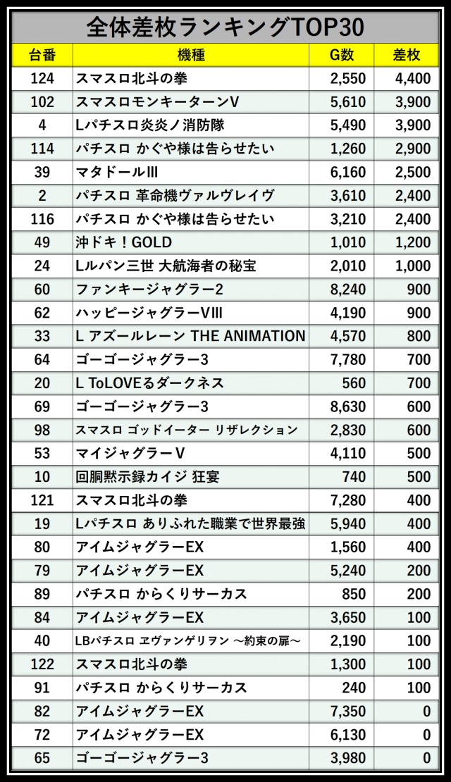 ※差枚数順に掲載しています