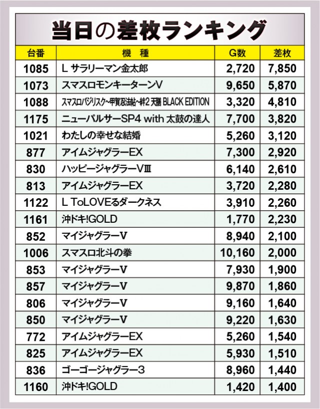 店内は高い活気に包まれており、それは上表から読み取れるだろう。『スマスロ北斗の拳』から万回転OVERが飛び出し、さらに『マイジャグラーⅤ』も閉店までじっくりと打ち込まれていた。その中でまとまった出玉が確保され、『L サラリーマン金太郎』7,850枚や『スマスロモンキーターンV』5,870枚などの大台突破も発生。大きな熱気に包まれた状況でもあり、ファンは有意義な時間を過ごせたことだろう。