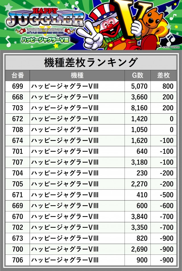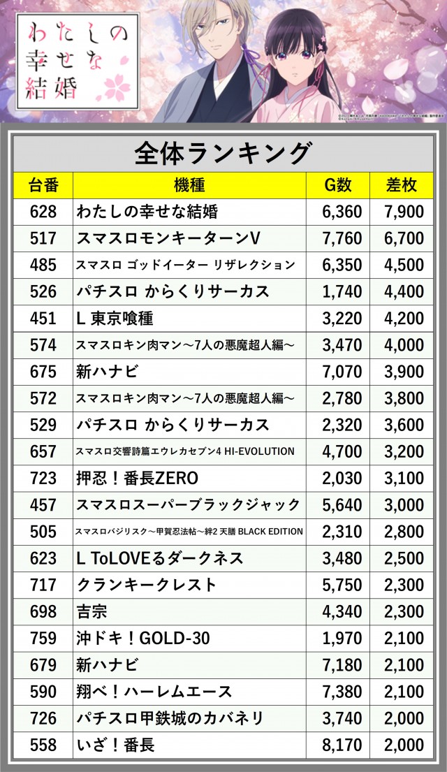 ※差枚数順に掲載しています