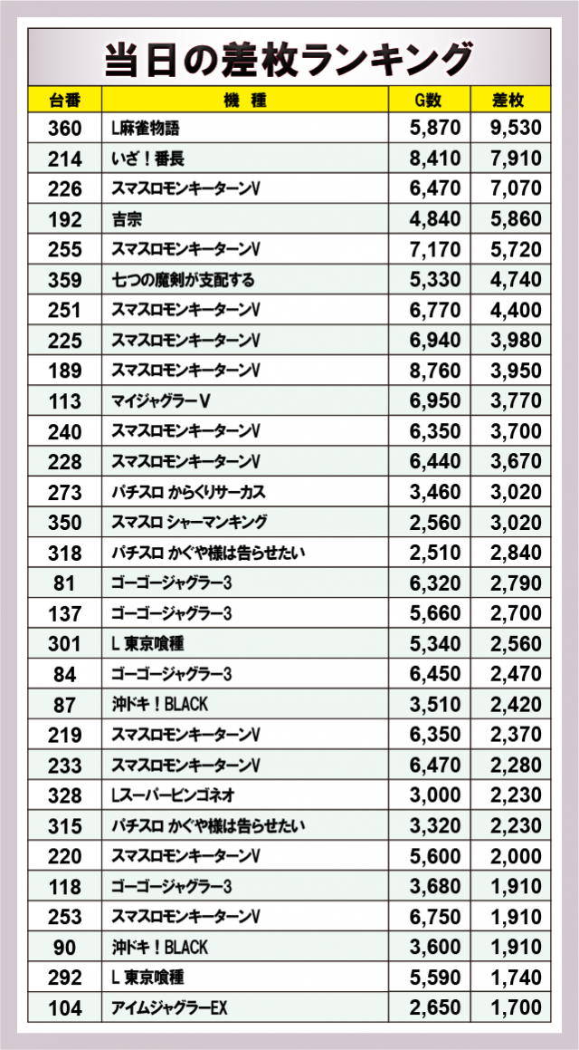※差枚数順に掲載しています。