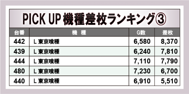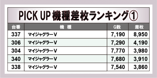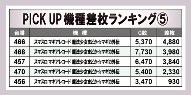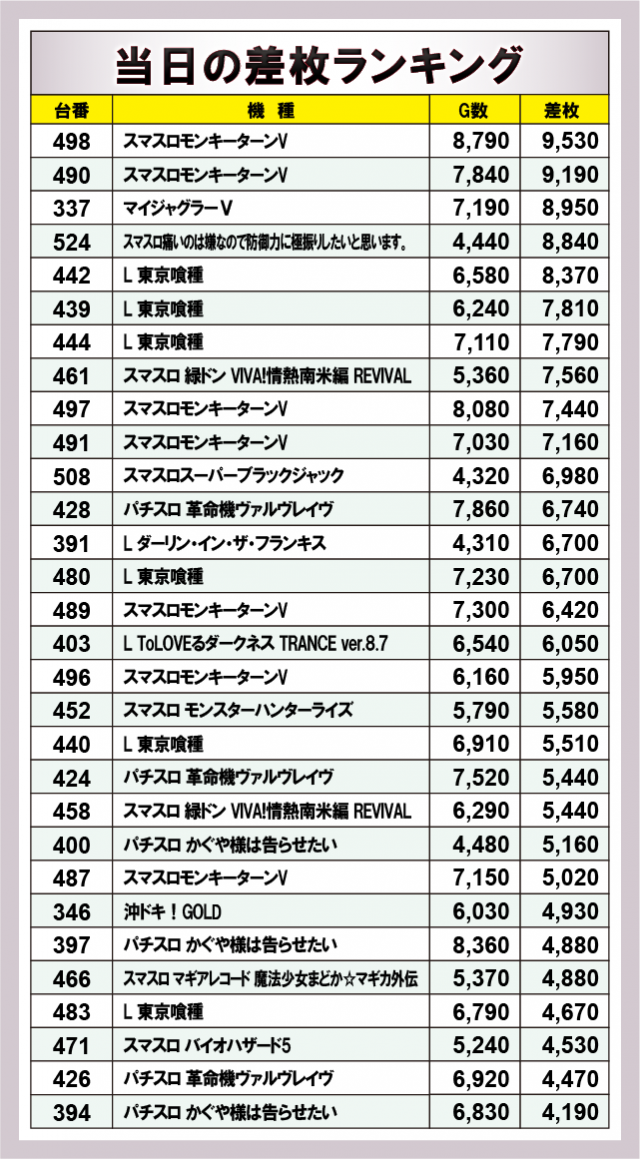 上表の『マイジャグラーⅤ』『スマスロモンキーターンV』『L 東京喰種』『パチスロ かぐや様は告らせたい』『スマスロ マギアレコード 魔法少女まどか☆マギカ外伝』は、大きな活気で店内の盛り上がりをリード。いずれもプラス差枚数を達成している台が多く、遊技していたファンの笑顔が想像に容易い。