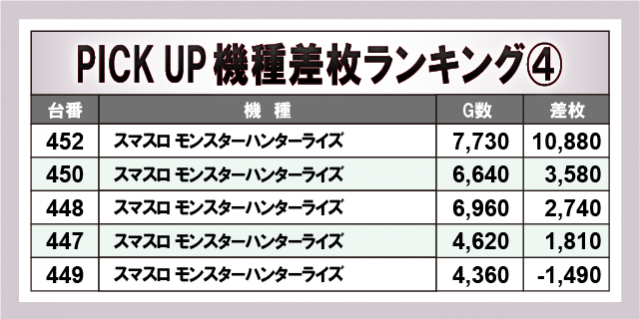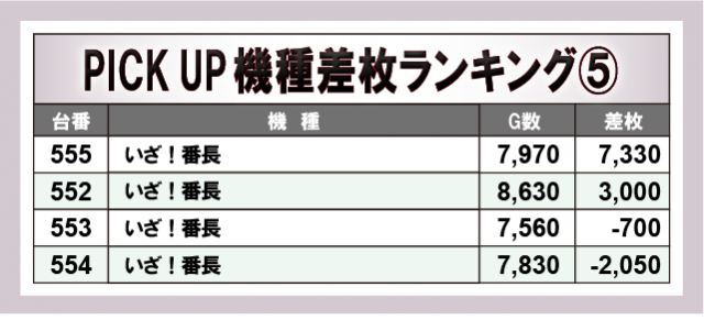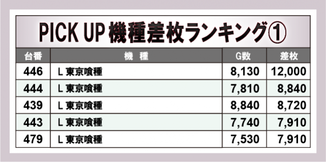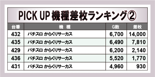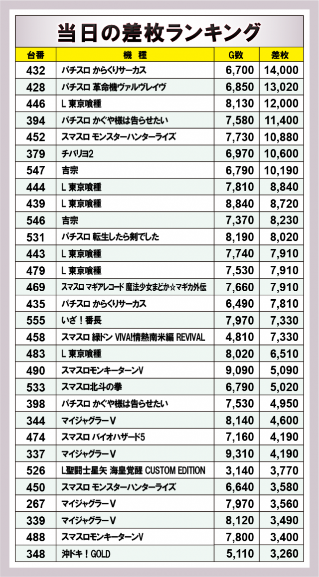 差枚ランキングには人気機種を中心に名を連ねており、その中で万枚OVERはなんと7台発生!他にもまとまった出玉を確保しており、ファンは満足度の高い1日を過ごしていたことだろう。それは回転数が示しており、8~9,000回転台をマークする台が多く見られた点から、相当な手応えを感じていたのは確かだ。