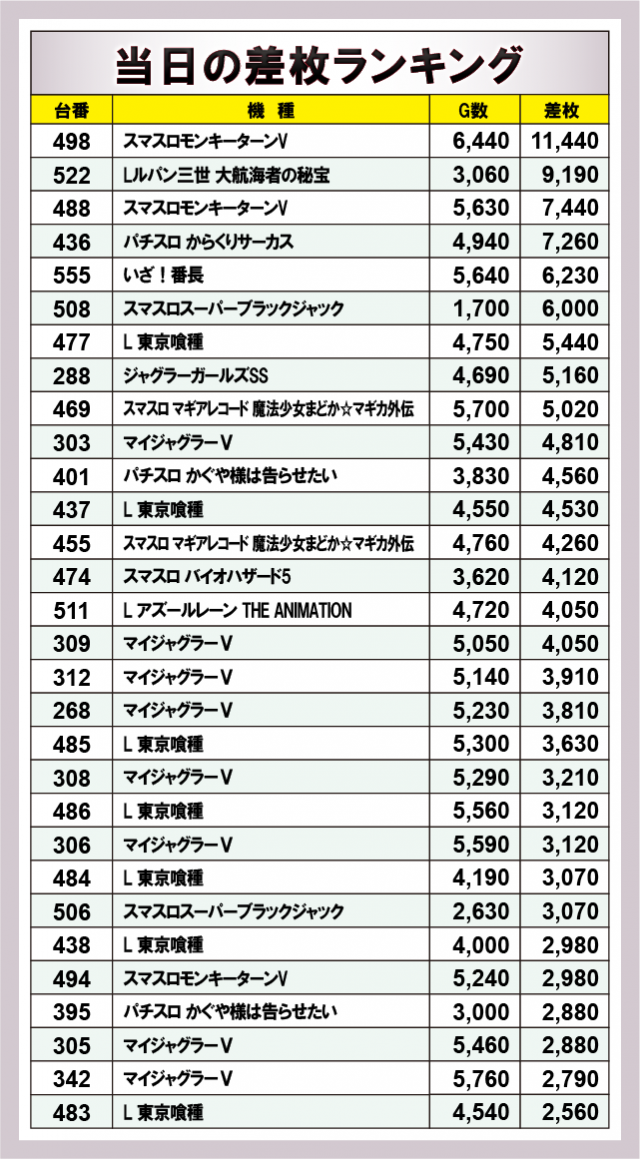※差枚数順に掲載しています。