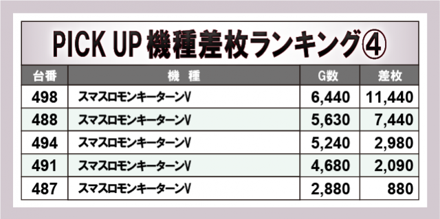 『スマスロモンキーターンV』から万枚OVERが生まれ、さらには『Lルパン三世 大航海者の秘宝』で9,000枚OVERと続き、店内の熱気をリードする存在となっていた。その後ろにも大台突破を果たした台が見られ、全体的にスマスロのみならず『ジャグラー』シリーズも多くランクインしていることから、スペック問わずあらゆる機種にチャンスが潜んでいたと言える。