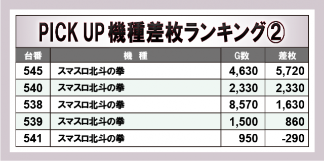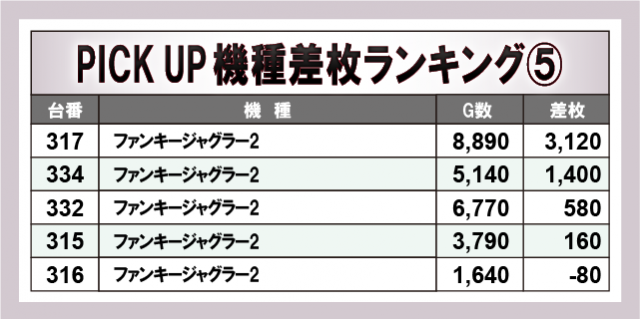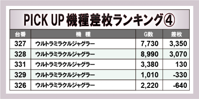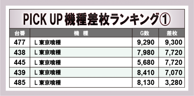上表の5機種は秘めたポテンシャルを存分に発揮しており、なかでも『L 東京喰種』『マイジャグラーⅤ』は機種単位での活躍が目立ち、まとまった出玉を確保する台が多数うまれている。また『ウルトラミラクルジャグラー』『ファンキージャグラー2』から3,000枚OVERが発生していることから、コンスタントな大当りを披露しては右肩上がりに出玉を伸ばしていったようだ。いずれも回転数と差枚数が比例する展開を披露しており、存在感をアピールしていた事実はファンにとって打ち込み甲斐があったのではないだろうか。