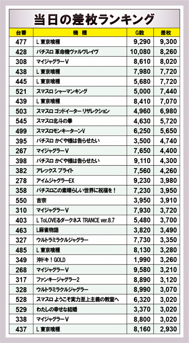 『L 東京喰種』で9,000枚OVER、『パチスロ 革命機ヴァルヴレイヴ』『マイジャグラーⅤ』で8,000枚OVERと続き、ハイスペック機種からノーマルタイプまで素晴らしい活躍をみせていた!その他まとまった出玉を獲得する台が多数出現しており、TOP30台はほぼ3,000枚OVERからとなっていることも館内の熱量を窺える内容となっている。遊技するファンは胸を躍らせ、有意義な時間を過ごしていたことだろう。