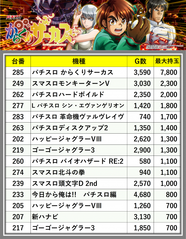 厳選された取材対象機種をはじめ、その他スロット全体から好記録が飛び出した!プレイヤーが楽しんだ1日を下記データにて振り返ってみて欲しい。