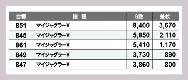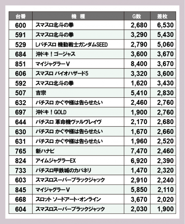※差枚数順に掲載しています