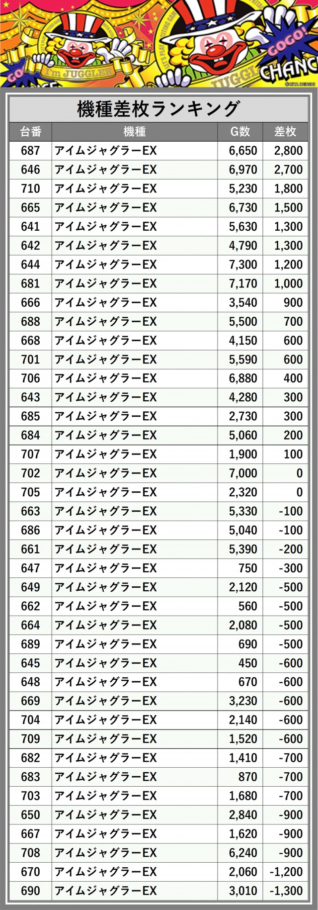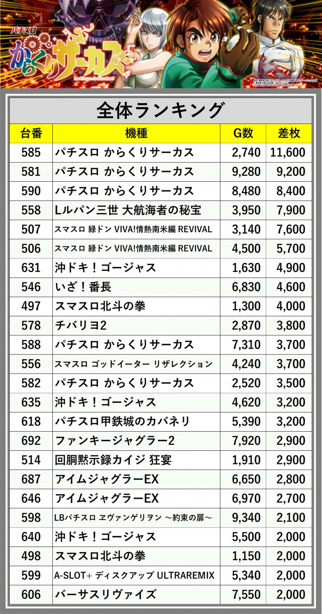 厳選された取材対象機種をはじめ、その他スロット全体から好記録が飛び出した!プレイヤーが楽しんだ1日を下記データにて振り返ってみて欲しい。