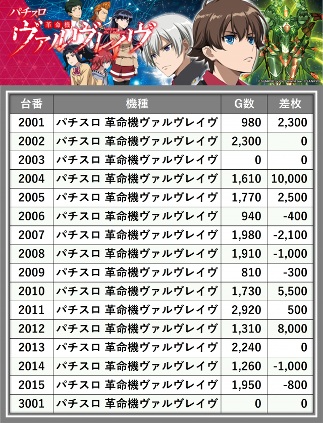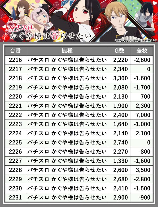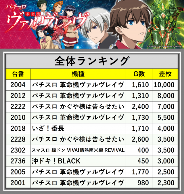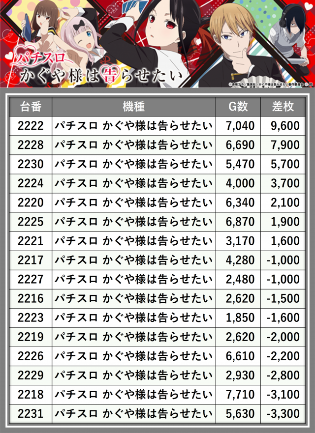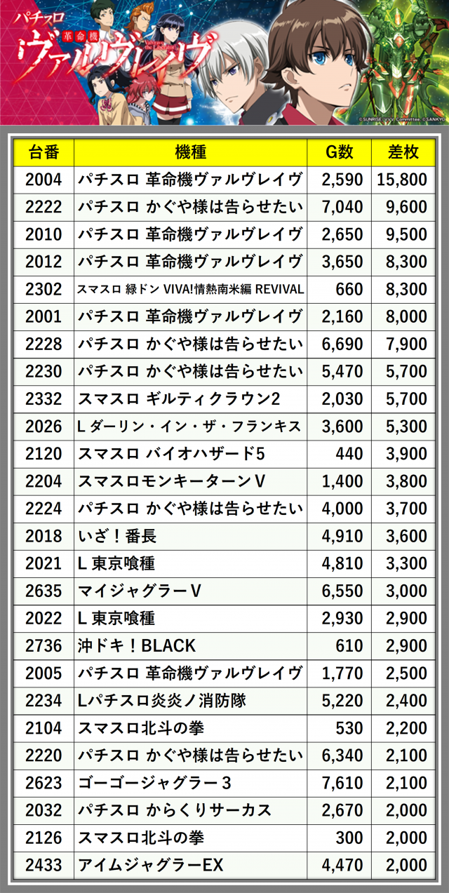 ※差枚数順に掲載しています