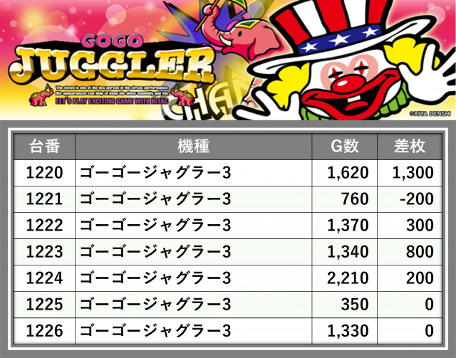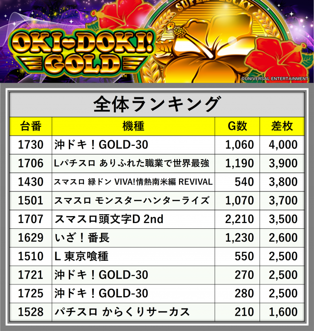 厳選された取材対象機種をはじめ、その他スロット全体から好記録が飛び出した!プレイヤーが楽しんだ1日を下記データにて振り返ってみて欲しい。
