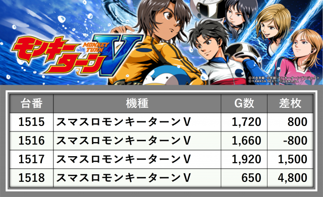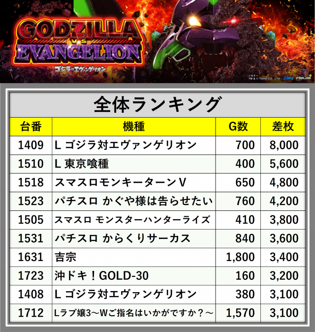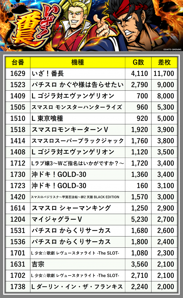 厳選された取材対象機種をはじめ、その他スロット全体から好記録が飛び出した!プレイヤーが楽しんだ1日を下記データにて振り返ってみて欲しい。