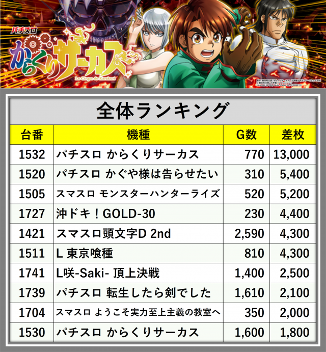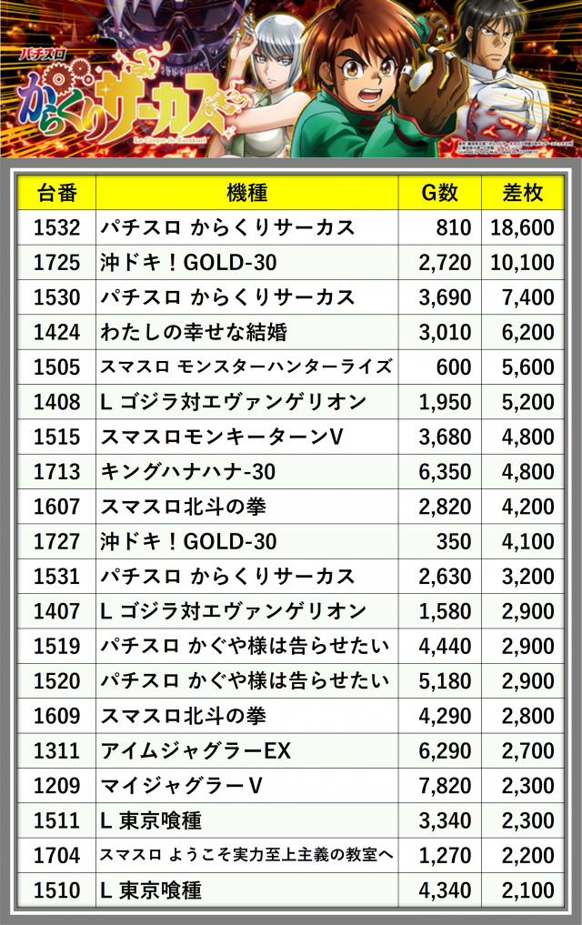 厳選された取材対象機種をはじめ、その他スロット全体から好記録が飛び出した!プレイヤーが楽しんだ1日を下記データにて振り返ってみて欲しい。