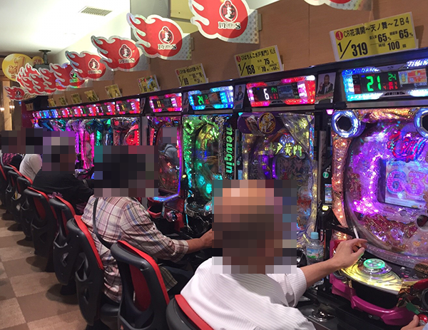 15時を過ぎた頃の4円パチンコでは、「CR牙狼GOLDSTORM翔」と海物語シリーズが盛況。ポテンシャルを発揮しているといったプレイヤーが多く、活気のあるシーンもみられた。