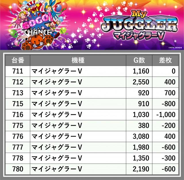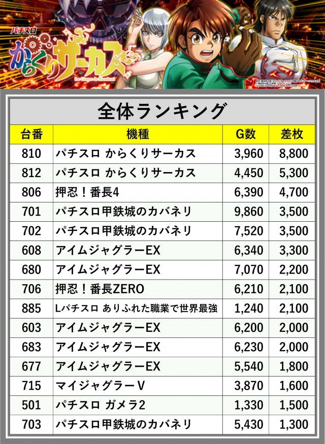 厳選された取材対象機種をはじめ、その他スロット全体から好記録が飛び出した!プレイヤーが楽しんだ1日を下記データにて振り返ってみて欲しい。