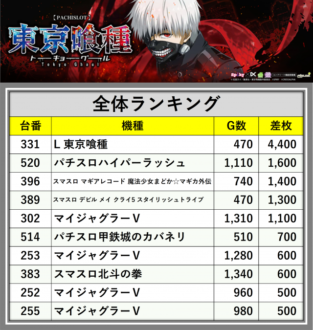 厳選された取材対象機種をはじめ、その他スロット全体から好記録が飛び出した!プレイヤーが楽しんだ1日を下記データにて振り返ってみて欲しい。