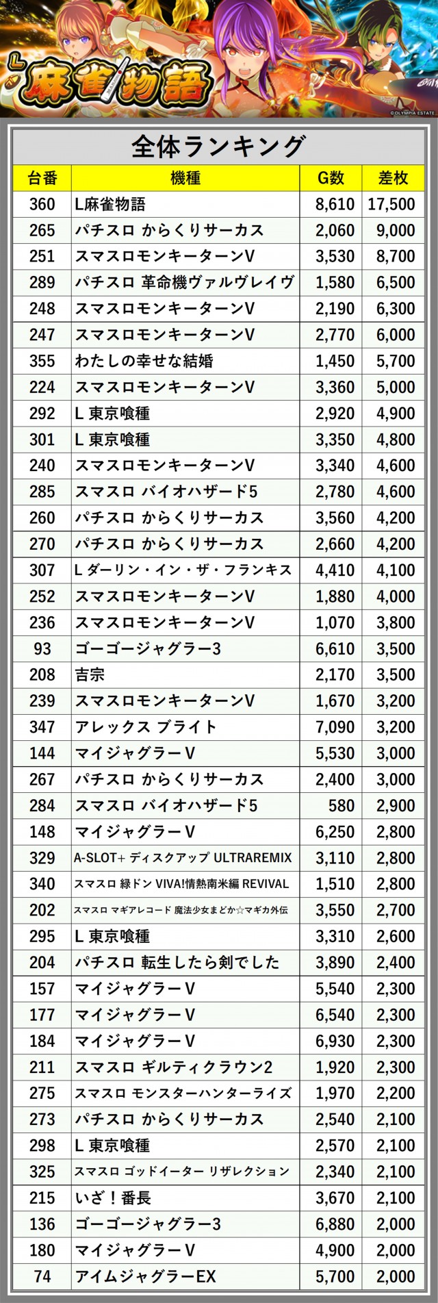 厳選された取材対象機種をはじめ、その他スロット全体から好記録が飛び出した!プレイヤーが楽しんだ1日を下記データにて振り返ってみて欲しい。