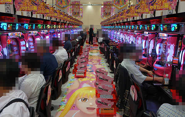 14時頃の4円パチンコでは、「ぱちんこCR真・北斗無双」と海物語シリーズが盛況。シマ全体に広がる華やかな光景が、満足度の高さをあらわしているようであった。