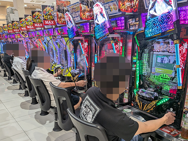 14時半ごろの500円/115玉パチンコでは、「新世紀エヴァンゲリオン〜未来への咆哮〜」や「e東京リベンジャーズ」、「eフィーバー炎炎ノ消防隊2 紅丸ver.」でプレイヤーが華麗なパフォーマンスを披露。微笑ましいシーンを随所で目にしている。