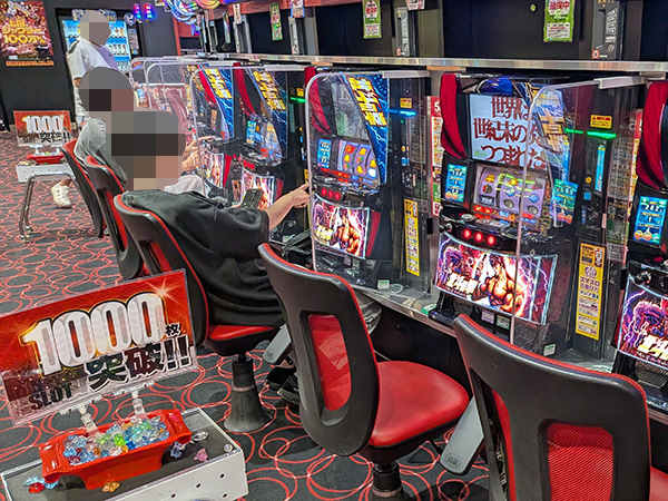 1000円/184枚パチスロの稼働も高い。楽しそうにレバーを叩くプレイヤーの姿を複数目撃している。