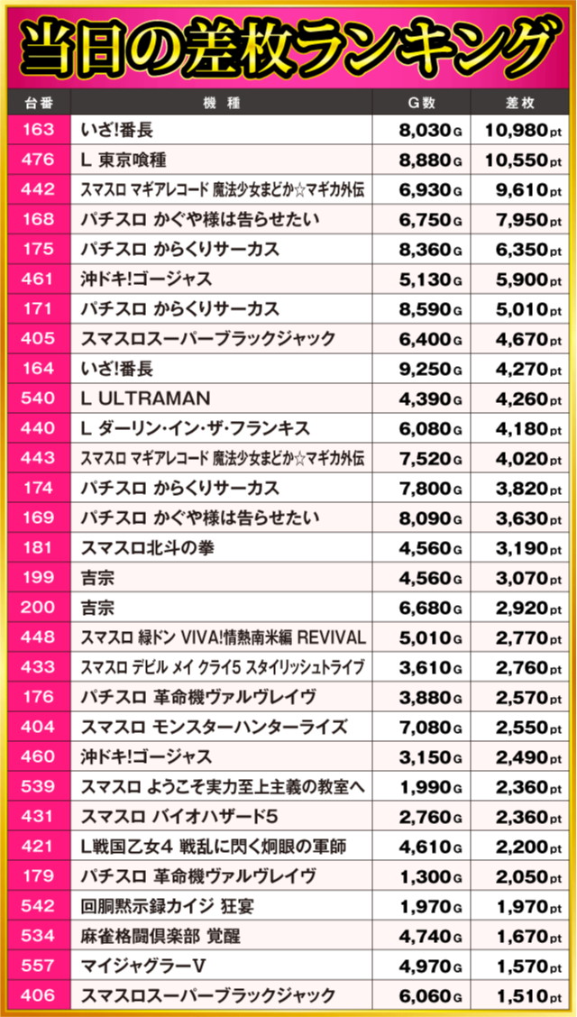 店内の状況をチェックすると、『いざ!番長』と『L 東京喰種』が万枚超を達成、『スマスロ マギアレコード 魔法少女まどか☆マギカ外伝』が+9,610ptを記録するなど、人気のスマスロを中心にハイスコアが続出。さらに、その他にも様々な機種から+5,000ptが大量発生しており、広範囲に渡ってチャンスが潜んでいたのは間違いないだろう。