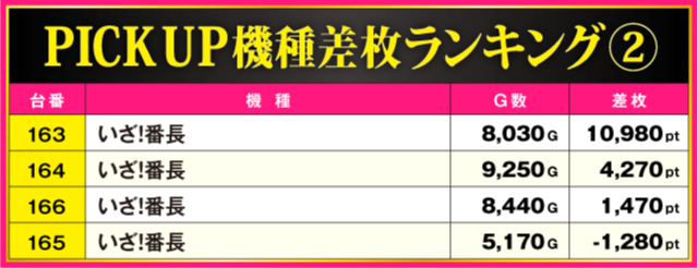 今回のPICK UP機種は全3機種で、差枚上位にランクインした台以外からも複数の好調台を確認。なかでも『スマスロスーパーブラックジャック』が+4,670ptを筆頭に、設置されている3台全てがプラス差枚で実戦を終える見事な結果を残している。3機種のファンにとっては、まさに充実の一日となったに違いないだろう。