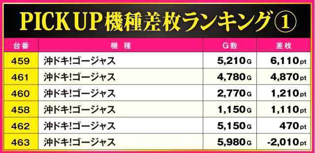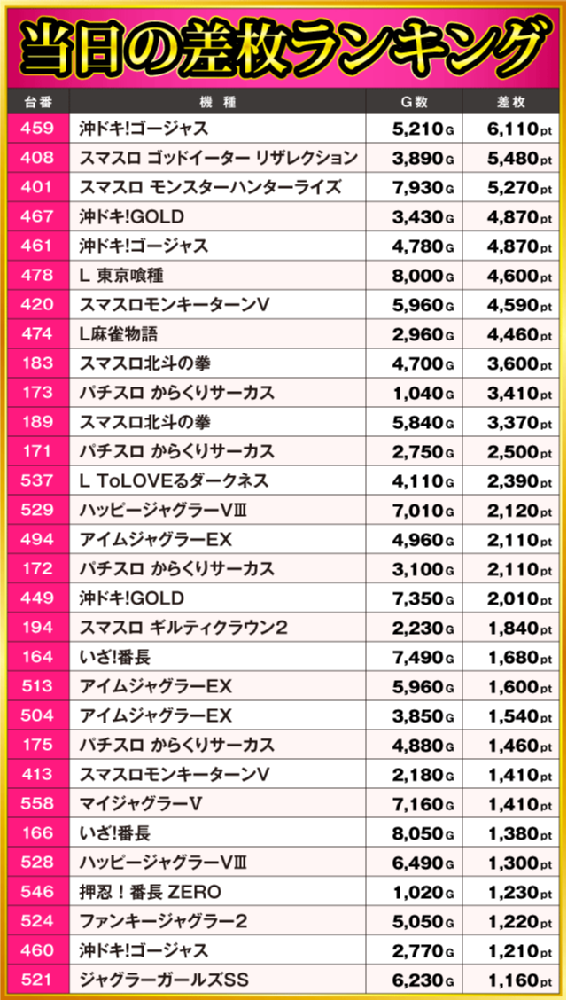 この日は、『沖ドキ!ゴージャス』が+6,110ptを叩き出しランキングトップに輝いた。次いで、『スマスロ ゴッドイーター リザレクション』と『スマスロ モンスターハンターライズ』が+5,000pt超を記録するなど、人気機種を中心に好成績が続出。さらに、ジャグラーシリーズも奮闘しており、複数の機種が差枚TOP30にランクインしている。
